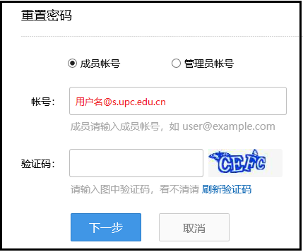 第三步:选择“成员帐号”,输入账号(账号为邮箱地址)和验证码,然后点击下一步,弹出发送验证码到密保手机的提示,再点击下一步。