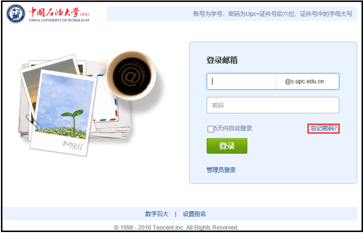 第二步:进入邮箱主页mail.s.upc.edu.cn,点击右边登陆框下方的“忘记密码”。