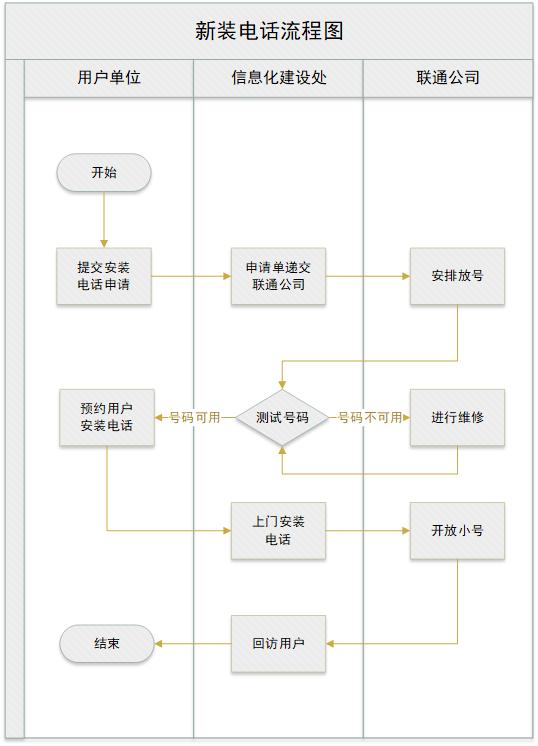 1:用户提交新装电话申请(一般以院系名义申请),写明需要安装电话的地点(必须准确到哪个楼的哪个房间)和号码属性(如是否开通市话,国内或国际长途和是否需要呼叫转移的功能等),写明缴费方式(如院系缴费或个人缴费)。留下