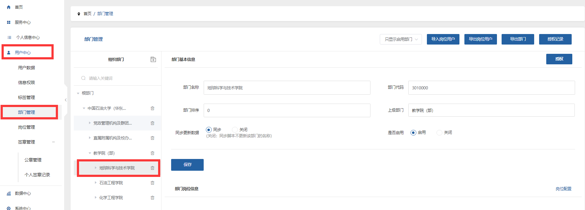 (2)点击“用户中心”-“部门管理”,找到相应单位或学院。