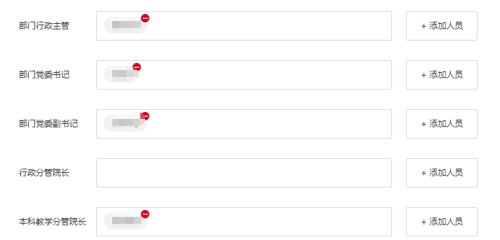 (3)点击“添加人员”新增、修改、删除各岗位审核人员,添加完成后,无须点击“保存”按钮。(可由各单位自行设置的岗位见表1)