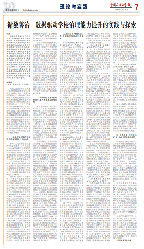 中国石油大学报:循数善治 数据驱动学校治理能力提升的实践与探索,相关链接 http://sydxb.upc.edu.cn/search?channelid=12168&searchword=%u62A5%u540D=%D6%D0%B9%FA%CA%AF%D3%CD%B4%F3%D1%A7%B1%A8*%u65E5%u671F=2021.10.30*%u7248%u6B212=007