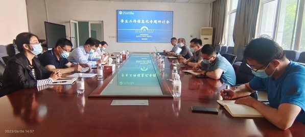 为深入学习贯彻党的二十大精神,推进主题教育理论学习走深走实,进一步推进学生管理信息化建设,6月6日,必赢3003no1线路检测中心处长郝志杰带队到党委学生工作部开展主题教育调研,党委学生工作部副部长张程、学生就业指导中心副主任朱景顺及相关人员与会。