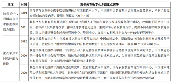 非盟2016年发布《非洲大陆教育战略(2016—2025)》,提出借助信息通信技术和在线课程提供创新性培训的高等教育发展目标。《非洲数字转型战略(2020—2030)》从加强数字化技术教育、促进数字化技术应用、提高公众认识三个方面对实现数字技术与教育的融合提出政策建议,包括在小学、中学、大学和职业培训中推行数字化教育、加强职前教师和在职教师的技术培训、对提供技术培训的机构进行认证等。疫情暴发后,《非洲数字化教学政策指南》提出DOTSS数字化教学措施,从数字技术连接、在线和离线学习、教师作为促进和推动者、线上教育安全和以技能为中心的学习五个方面阐述非洲数字化教学的发展方向。