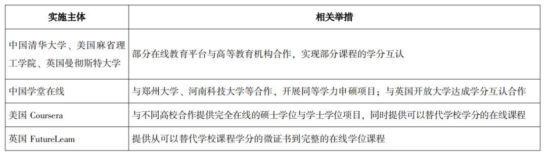 在学分认证方面,主要存在两种形式:一是学生于在线平台上选修指定课程,考核合格的学生可自愿进行学分认定;二是高校之间为丰富学生选择,互相开放部分课程,供外校学生线上或线下学习,通过考核后进行学分认证。表1展现了部分国家对在线教育课程学分认证采取的相关举措。