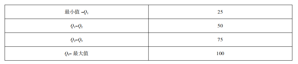 将全部数据从小到大排列,正好排列在前1/4位置上的数(25%位置)为第一四分位数,排在后1/4位置上的数(75%位置)为第三四分位数,排列在中间位置的数(50%位置)为第二四分位数,确保所有数据坐落在四个区间,再对相应区间进行赋值(示例见表8)。