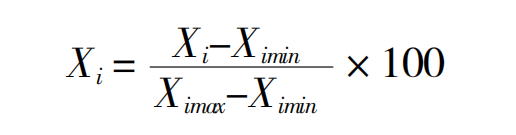 该方法也称为离差标准化,旨在将数据无量纲化,使之映射到[0,1]之间。该方法适用于数据值比较集中的情况,但极易受到最大值和最小值的影响,使得标准化结果不稳定,并影响到后续使用的效果。为便于后续分析,会将[0,1]的数据扩大100倍。