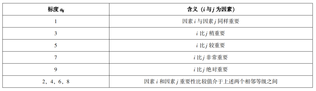 首先,按照由上到下(目标层到最低层)的顺序来构建层次模型。例如,考虑两个因素i和j。可以根据比例尺标度参考表对因素i和j顶的比较结果赋值a。