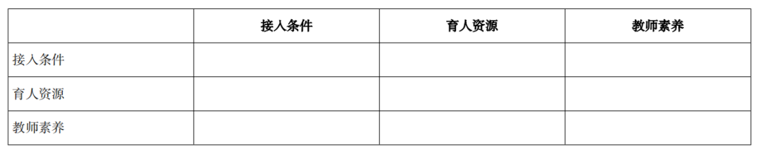由于二级指标有10个,理论上需要构建10个判断矩阵,但除了“接入条件”“育人资源”和“教学模式”以及“内部治理”等二级指标以外,其他6个二级指标与具体测量指标是一对一的关系,所以权重系数为1.0,意味着这6个二级指标并不需要构建判断矩阵来确定权重。