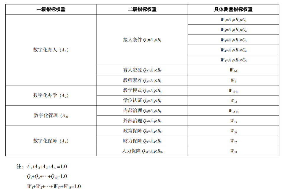 发展指数包含4个一级指标和10个二级指标以及18个具体测量指标。每一个指标都能从不同层面反映高等教育数字化发展水平,但它们在高等教育数字化发展指数中的权重并不相同,因此需要对高等教育数字化发展指数的所有指标建构权重。