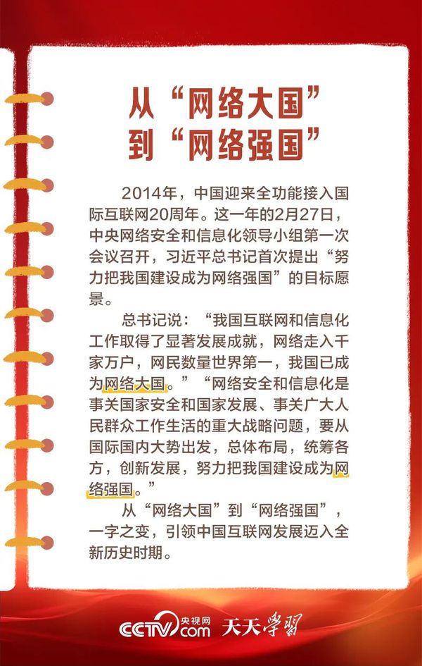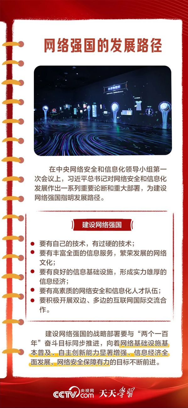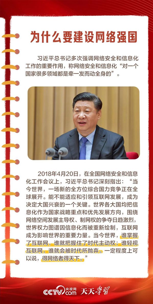党的十八大以来,习近平总书记高度重视网络强国建设,在网络强国建设实践基础上,提出了一系列新思想、新观点、新论断,形成了关于网络强国的重要思想。在这一重要思想引领下,我国互联网发展进入全新时代,网络强国蓝图徐徐铺展。 为何要建设网络强国?总书记谋划了一条怎样的网络强国之路?我们一起学习思考。(来源:中央广播电视总台央视网)