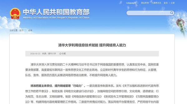 清华大学深入学习贯彻党的二十大精神和习近平总书记关于网络强国的重要思想,认真落实党中央、国务院重要决策部署,高度重视互联网这一宣传思想文化工作的主阵地,立足新时代青年学生的思想和行为特征,从管理、队伍、宣传、服务四方面扎实推进网络思想政治教育,不断提升网络育人能力。