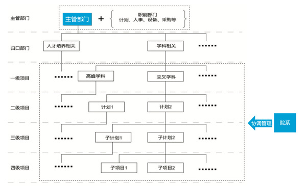 系统架构。主要基于学校“双一流”建设实施方案的举措任务,并按照项目管理模式组织实施,分别对应项目体系中一级项目。项目体系实行多层级树形结构,根据实际情况设置最多不超过四级项目层级。项目管理、预算管理和绩效管理均按照项目层级进行逐级管理(如图2所示)。