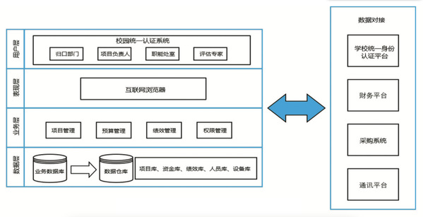 系统以项目流和资金流为主线,通过建立项目、经费、用户、绩效信息集成的中心数据库,统筹归口管理部门、预算审核部门、指标审核部门、各级项目实施单位、学院(系)、评估专家等多重角色,构建项目管理、预算管理、绩效管理、查询统计等项目生命周期功能模块,并主动对接校内相关数据中心实现数据有效交互及项目和资金的规范管理。