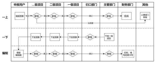 预算管理。第一,预算申报。底层项目为预算申报基本单位。项目实施单位根据建设方案及实际建设经费需求申报预算,提交后经各级项目实施单位→归口管理部门→人事部门(选)→主管部门→财务部门进行审核汇总(如图5所示)。预算申报界面以树状列表形式呈现,方便上级项目负责人检索、汇总。填报与审核采用同一页面操作,使操作更方便直观。预算申报审核完成后,系统自动汇总并核对预算数。