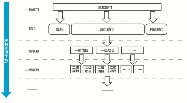 系统用户均为校内人员,通过学校统一身份认证系统提供统一入口,用户权限由上级部门(单位)分配。获得权限后可进行项目管理、预算管理和绩效管理等操作,同时可对下级部门(单位)分配人员权限。系统通过逐级权限分配完成权限体系的日常管理和维护(如图3所示)。